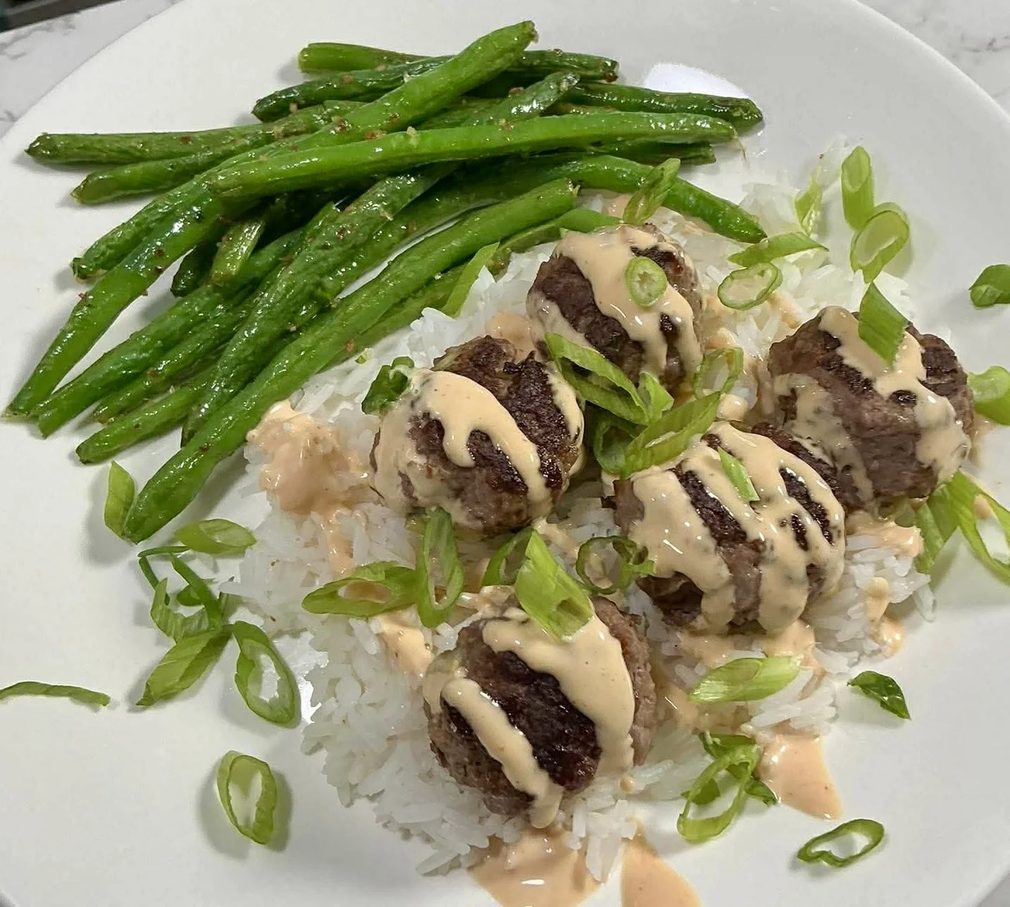 Divide the rice, green beans, and meatballs between two plates. Drizzle with bang bang sauce and top with the scallion greens.