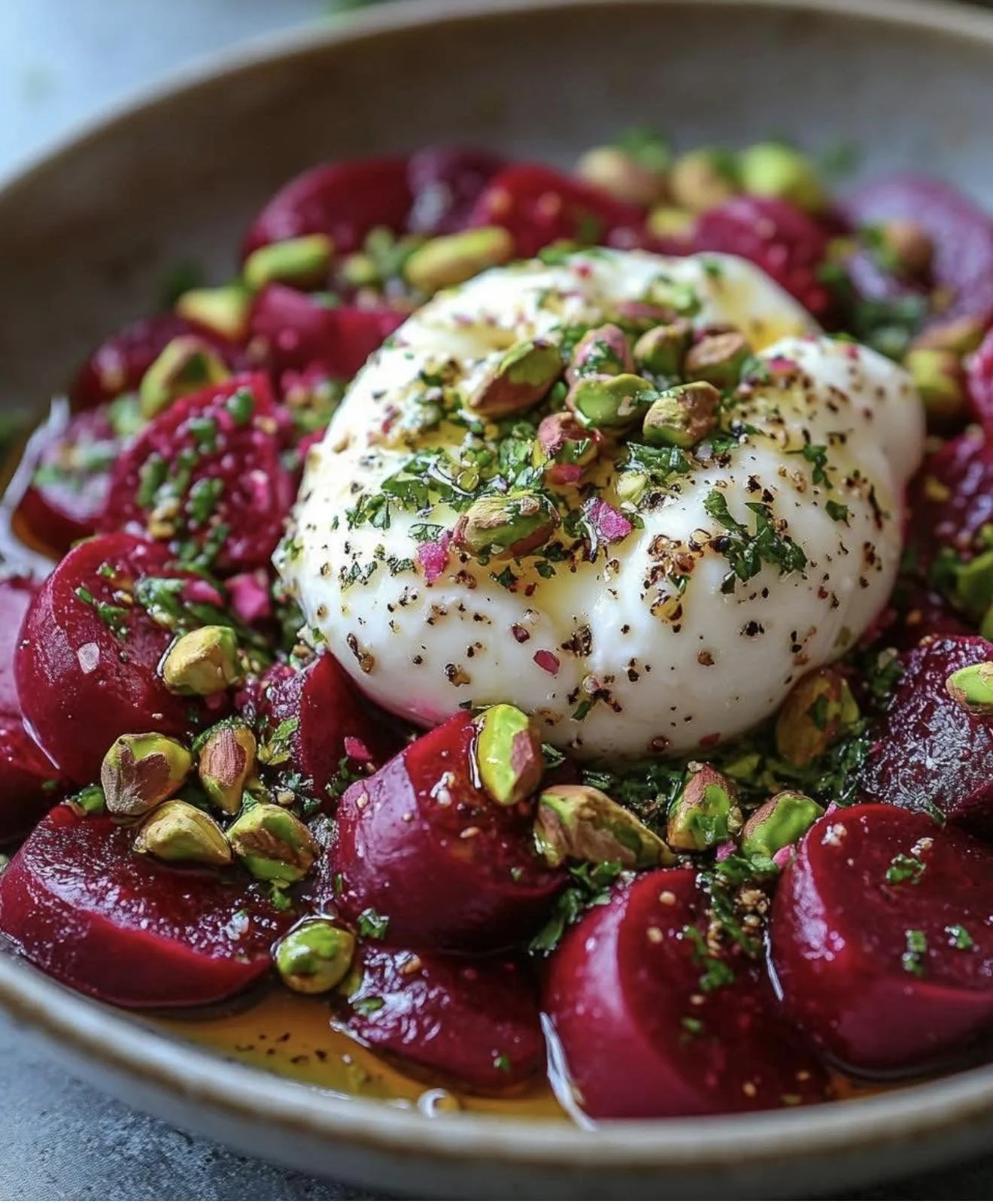 Assemble the Salad: Arrange the sliced beets on a serving platter. Tear or place the burrata cheese on top and sprinkle with chopped pistachios.