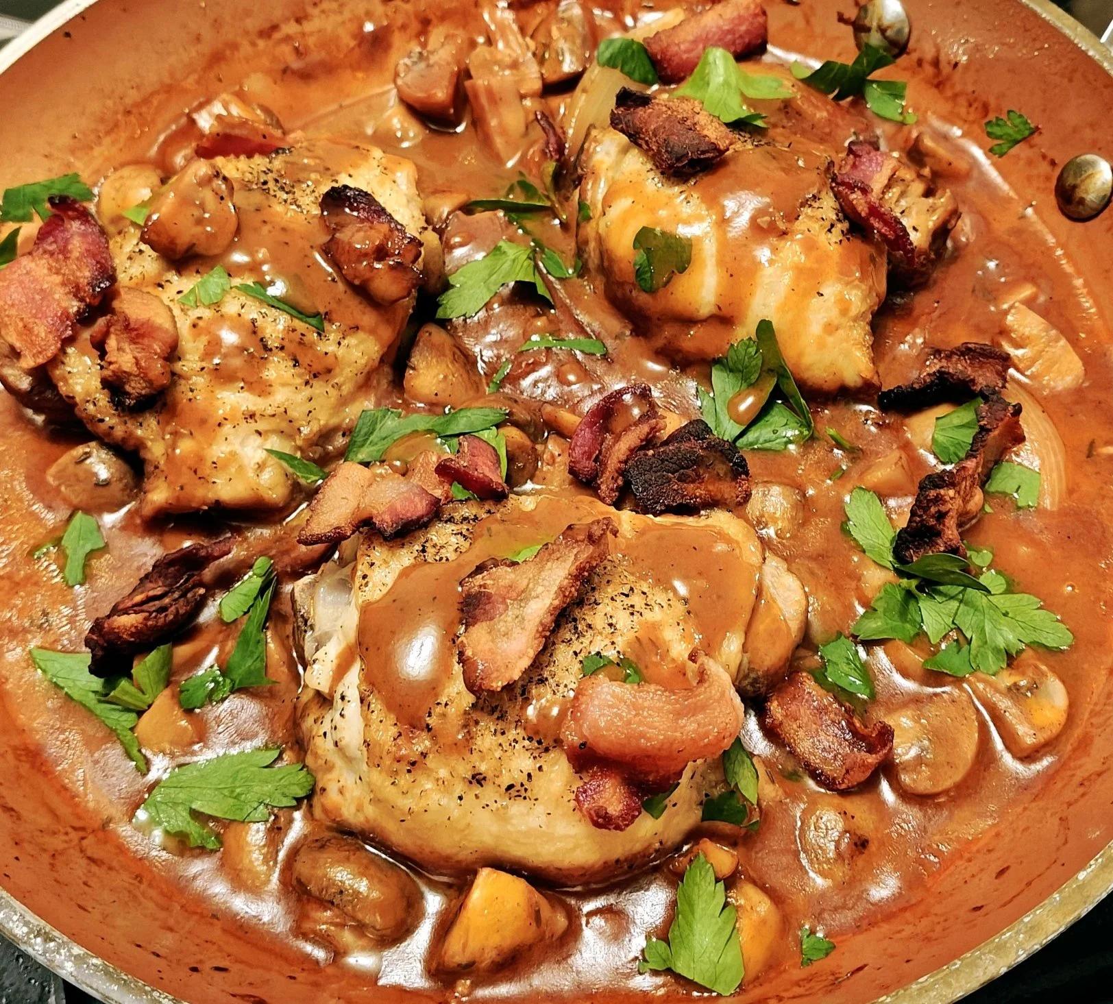 Simmer and Finish. Finally, nestle the chicken, skin-side up, into the sauce, making sure to pour in any juices that accumulated on the plate. Reduce the heat to medium-low, cover the skillet, and simmer until the chicken registers an internal temperature of 200°, which should take about 20 minutes. Remove the skillet from the heat and let the chicken rest, uncovered, in the sauce for 10 minutes. Season the sauce with salt and pepper to taste, then sprinkle the finished dish with parsley and the reserved crispy bacon before serving.