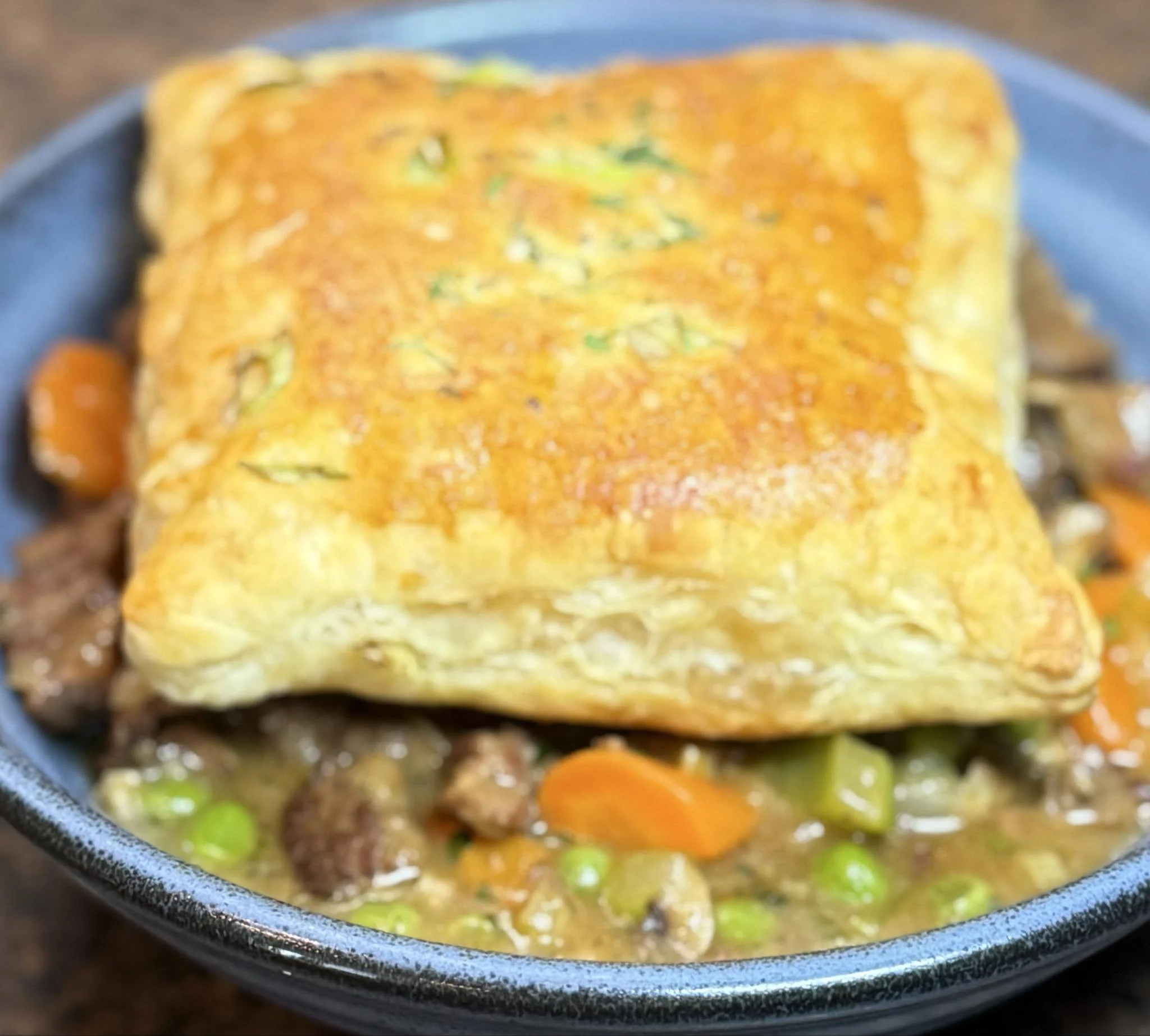 Beef Pot Pie, featuring tender, sherry-braised prime rib, a medley of sautéed vegetables, and a rich, herb-infused gravy. Topped with golden rosemary puff pastry squares, this gourmet comfort food delivers a cozy yet elegant dining experience. Perfect for leftover beef recipes, pot pie lovers, and upscale comfort food enthusiasts.
