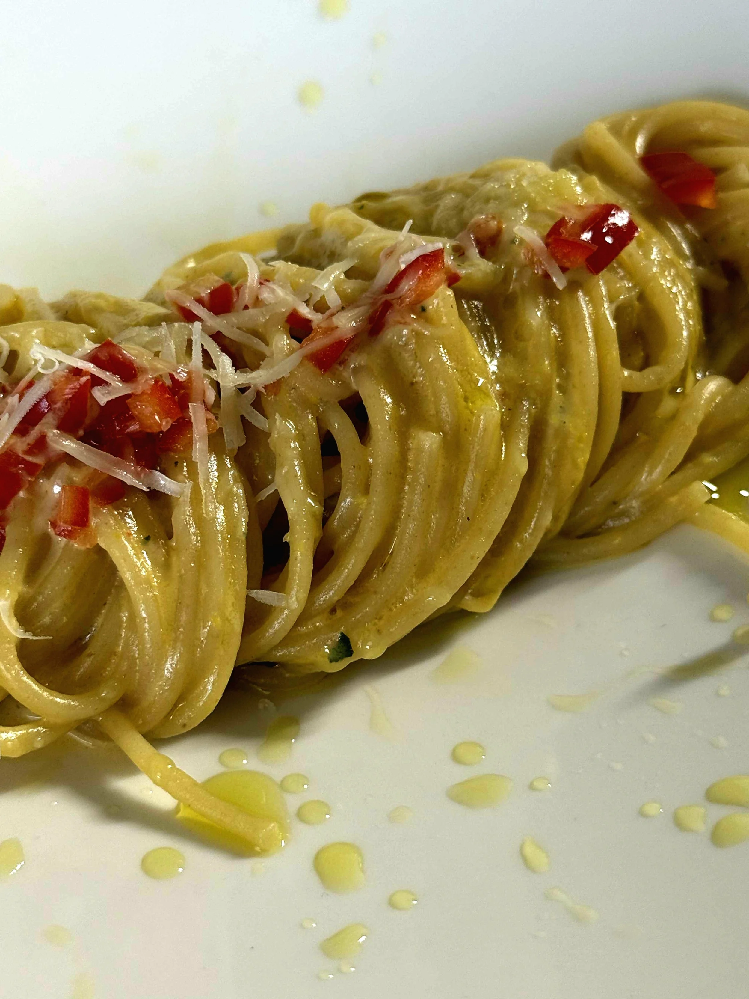 Combine: In the same sauté pan, heat the yellow bell pepper cubes briefly with a splash of oil. Add the strained sauce and cook for 30 seconds. Toss in the cooked pasta and stir for another 30 seconds.