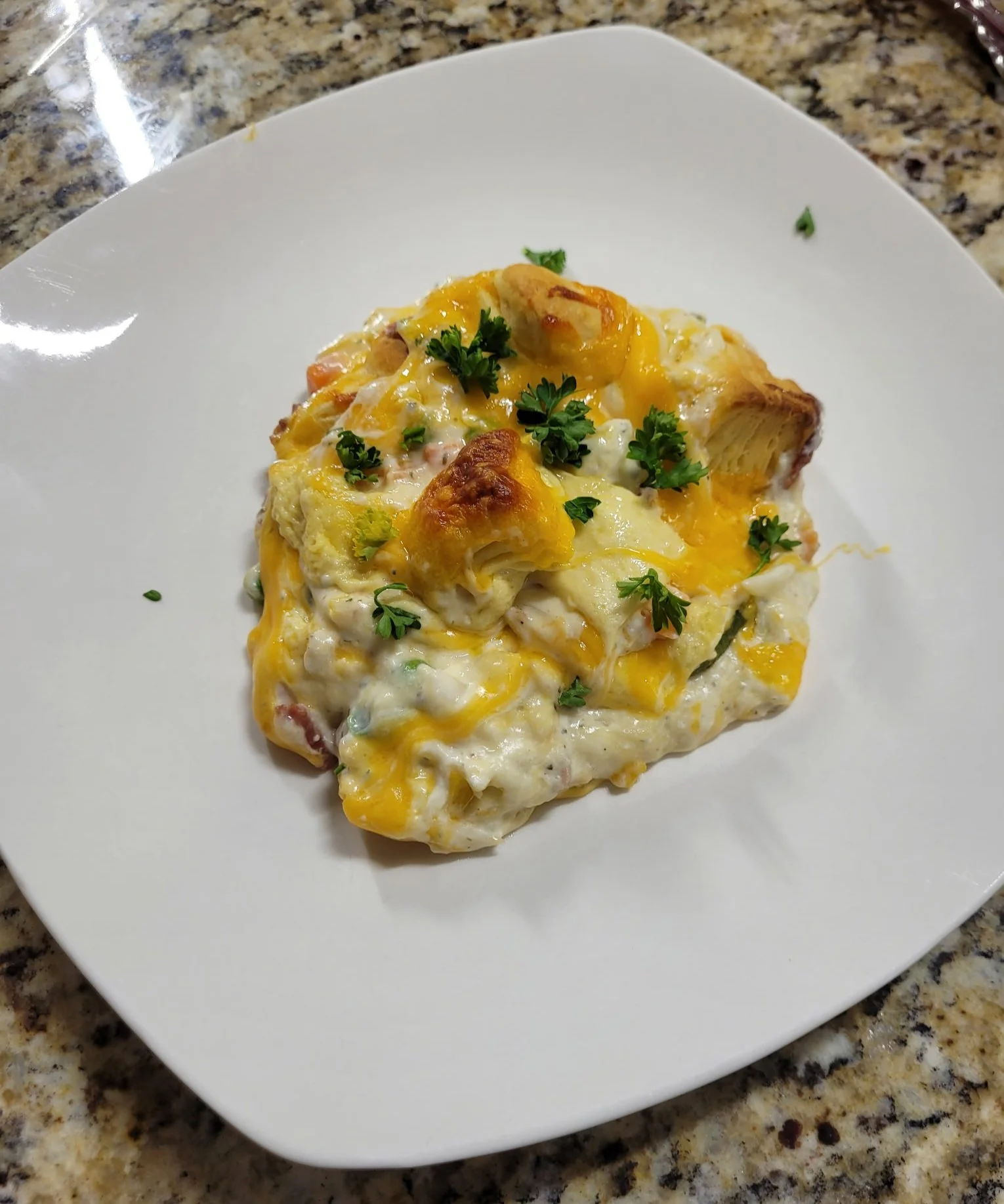 A rich and creamy one-dish wonder made with tender chicken, ranch seasoning, cheddar, cream cheese, and bacon—topped with golden biscuit pieces for the perfect comfort food bake. This easy casserole is ready in under an hour and packed with flavor in every bite.