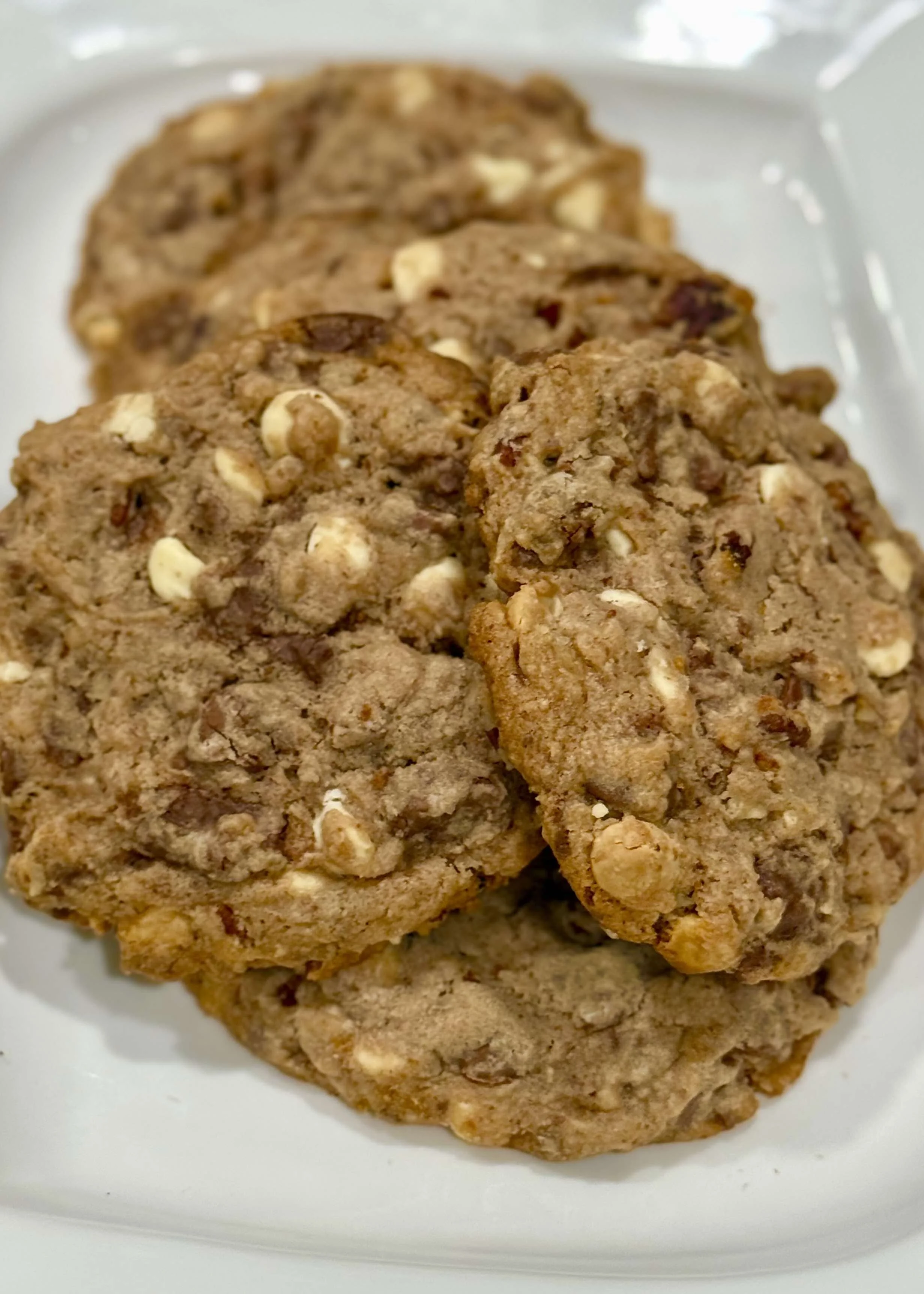 Fold in the chocolate chips, white chocolate chips, Heath brittle bits, and pecans until evenly distributed. If the dough feels soft or warm, chill for 15–20 minutes to help control spreading.