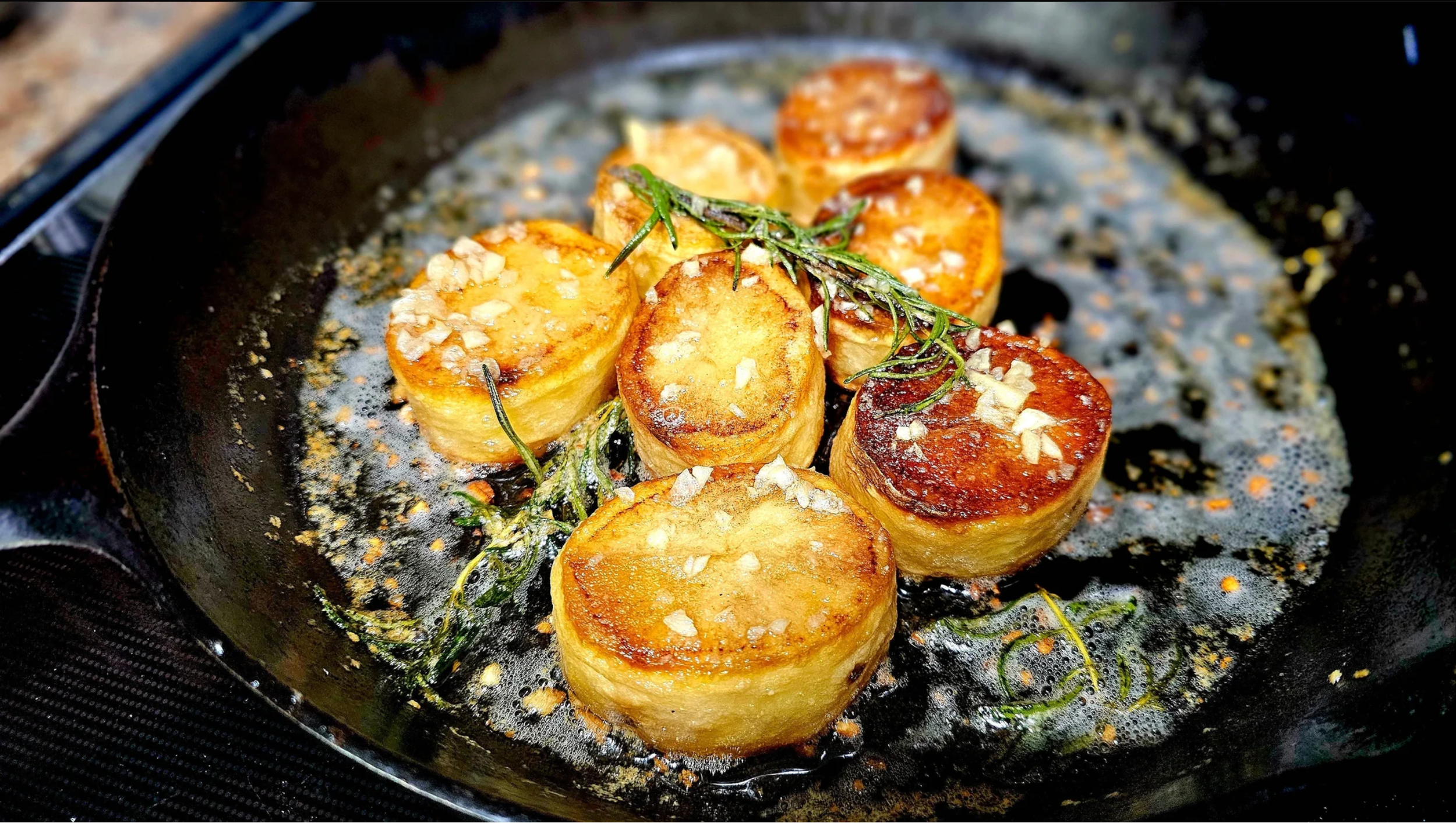 Roast: Transfer the skillet to a preheated oven (400°F / 200°C) and roast for 40 minutes. Remove from the oven and then to the stovetop with low heat. Add butter, garlic and herbs to the skillet and baste the potatoes for 3-5 minutes.