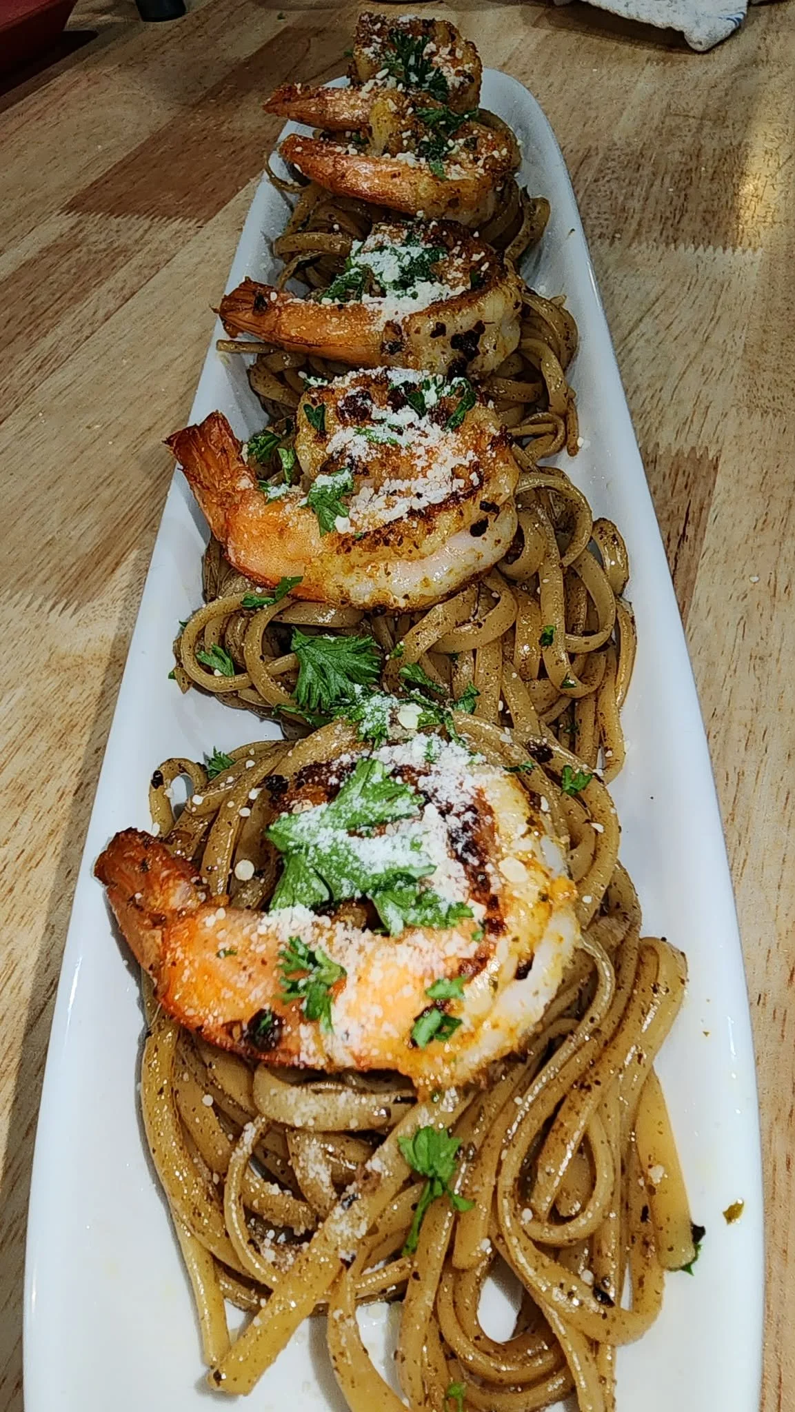 Spoon the garlic butter over the shrimp, remove from heat, and serve immediately over pasta.