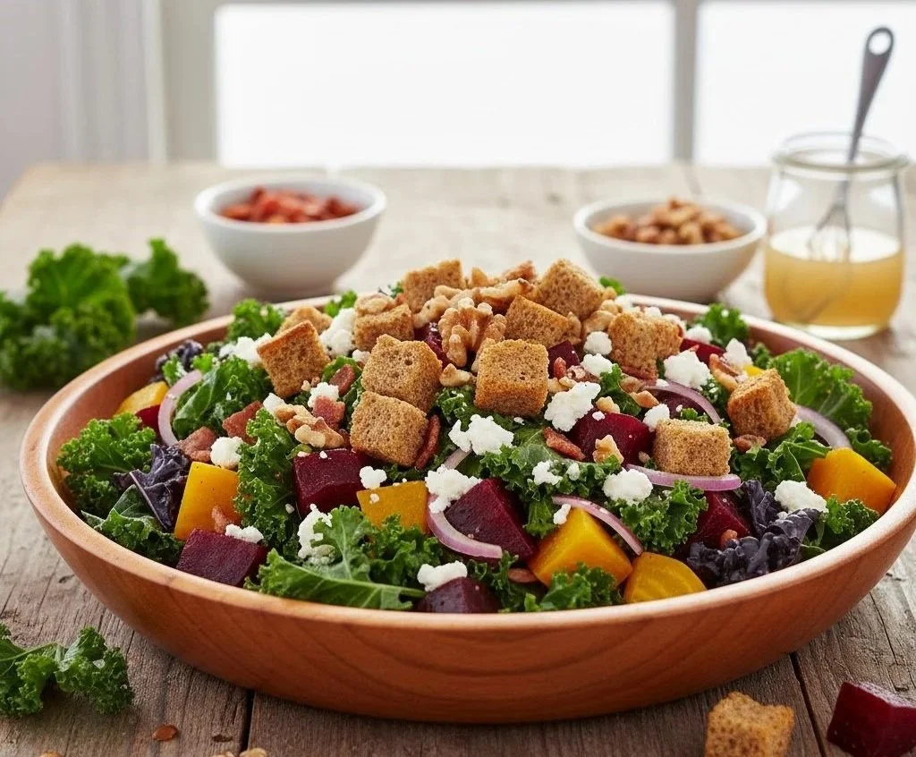 Assemble and Serve: Add the roasted beets, crumbled feta, bacon bits, and shaved red onion to the bowl with the massaged kale. Gently toss to combine all the ingredients evenly. Just before serving, sprinkle the salad with the toasted walnuts and the homemade rye pumpernickel croutons.