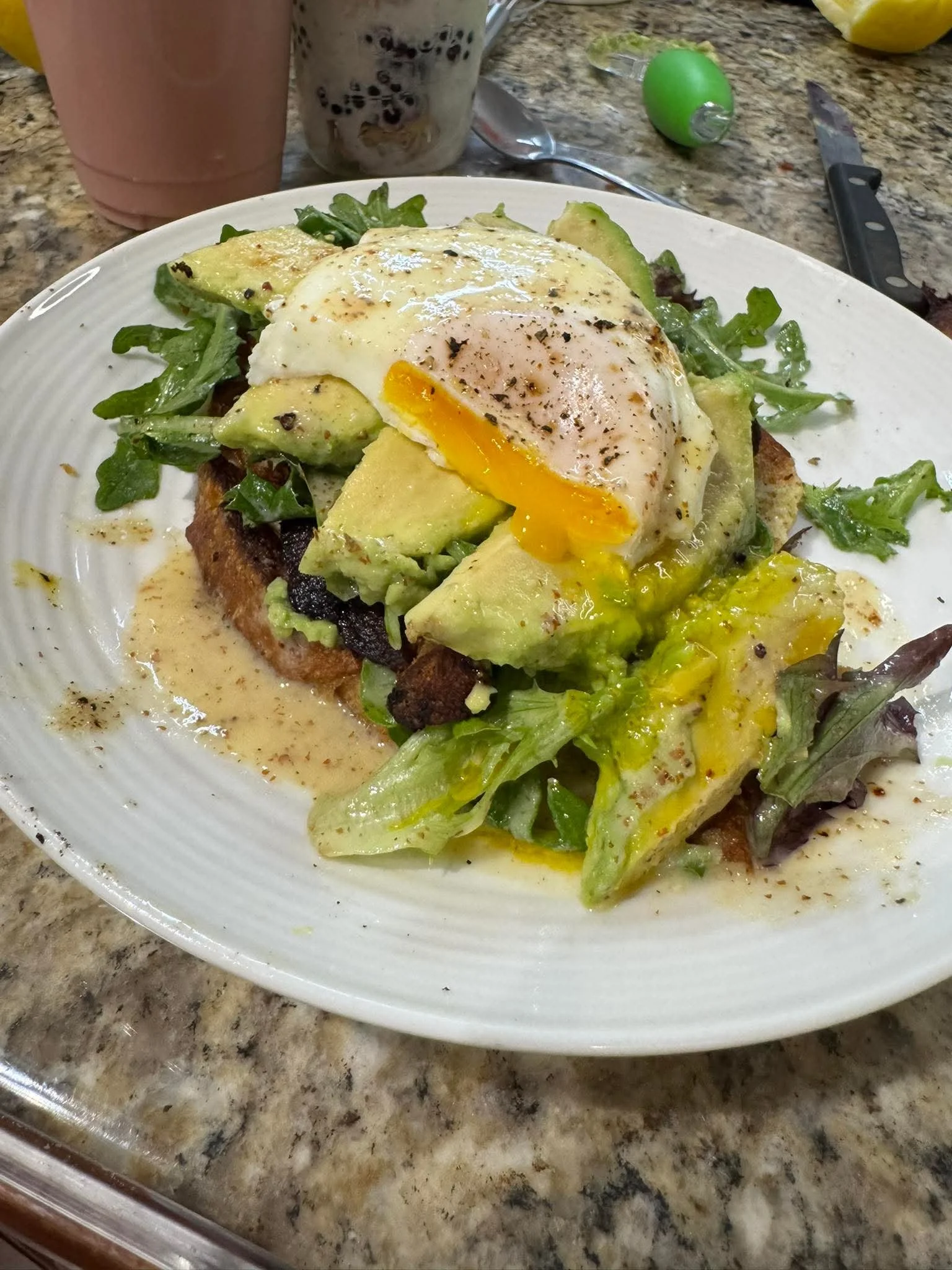 Crispy sourdough layered with creamy avocado, bacon, fresh greens, and a runny egg. Bright, rich, and balanced with a light lemon vinaigrette.