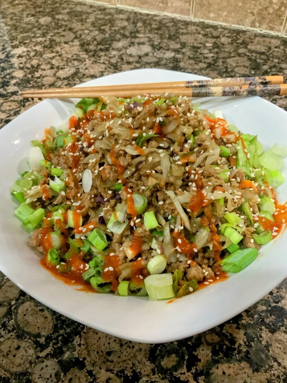 Maggie's Egg Roll in a Bowl Entree Oct 11 Written By Maggie the Substitute Teacher Watch @FoodTokTV LIVE’s on our Youtube channel Ingredients24 oz ground meat16 oz Coleslaw1 cup chopped green onion½ cup soy sauce1 TBSP rice vinegar1 tsp ground ginger1 tsp garlic powder DirectionsCook your ground meat on medium heat until it browns.Add remaining ingredients and cook to your preferred tenderness. Ground beefGround pork Maggie the Substitute Teacher