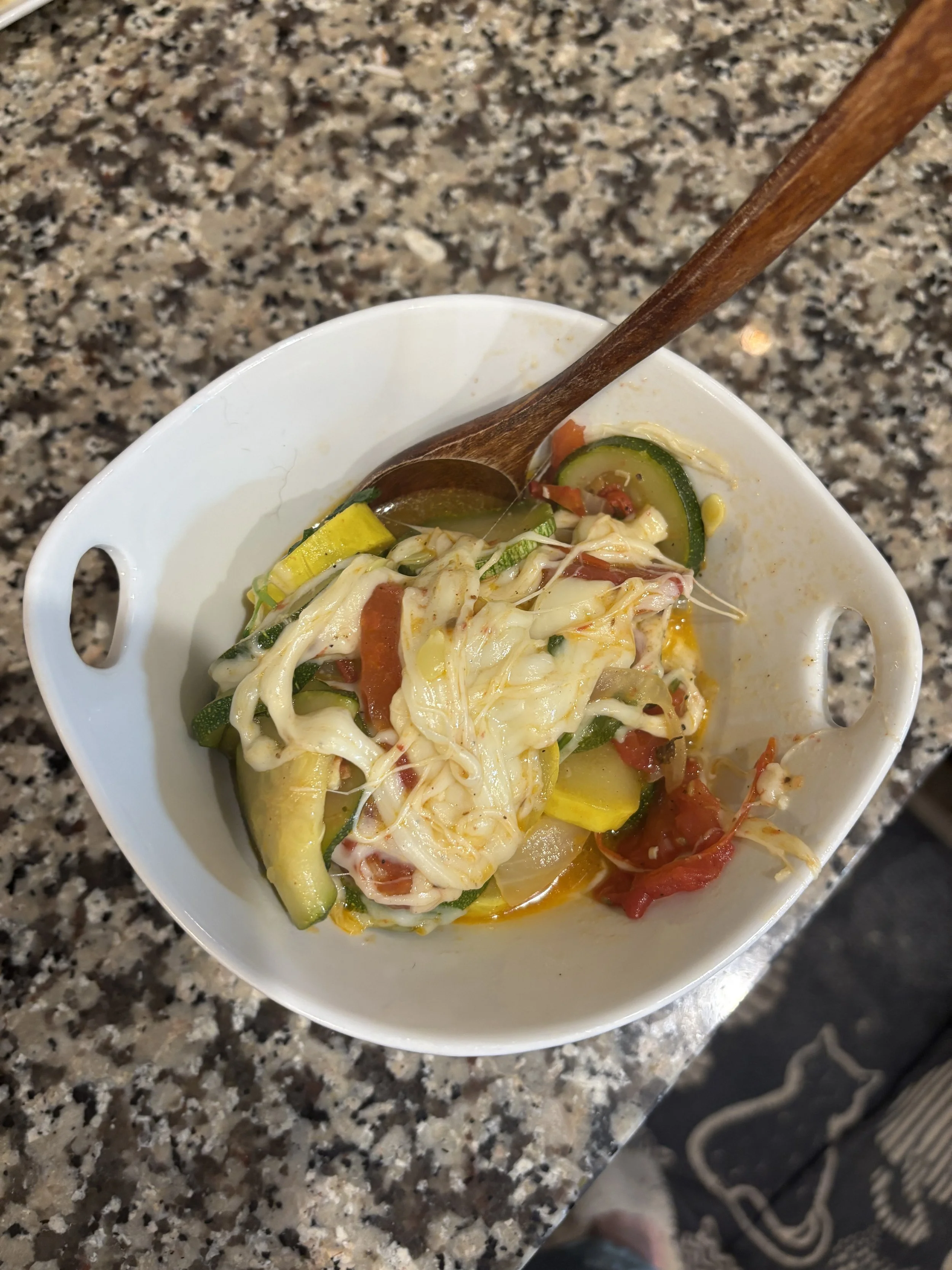 Melt the Cheese: Sprinkle grated cheese over the vegetables. Cover briefly until cheese melts into the dish.