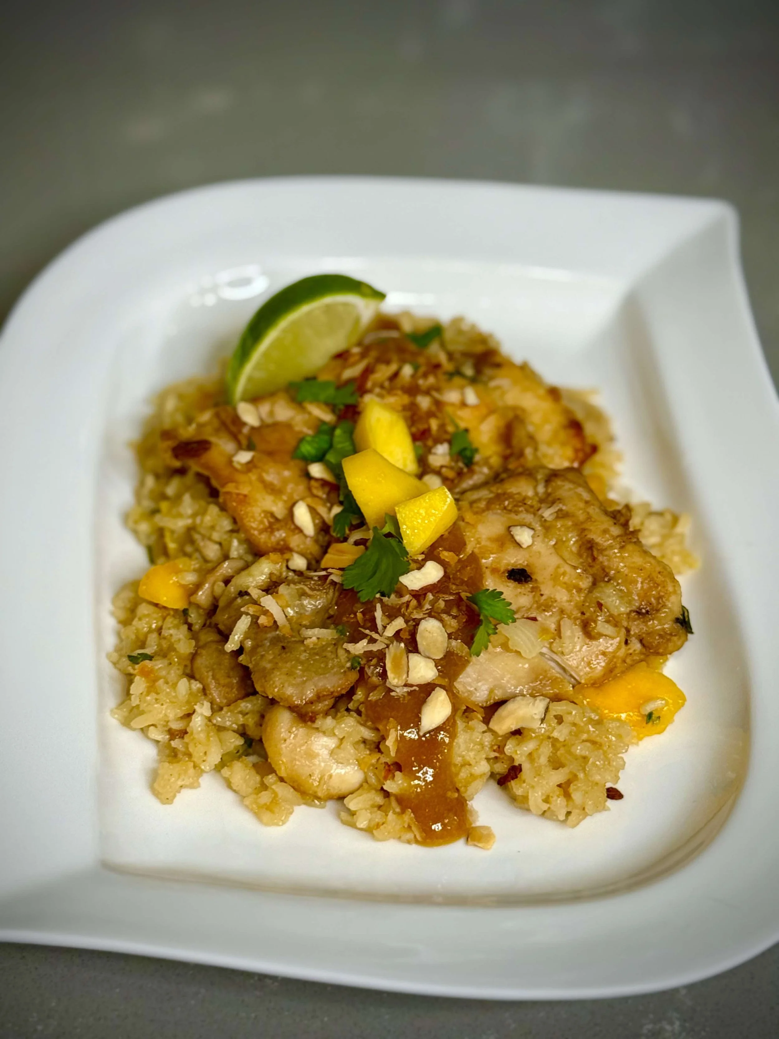 This bold, one-pot meal brings juicy seared chicken, creamy coconut rice, sweet mango, and Queen G’s sweet heat all together — topped with toasted coconut, sliced almonds, and bright, fresh herbs. Easy to serve, hard to forget.