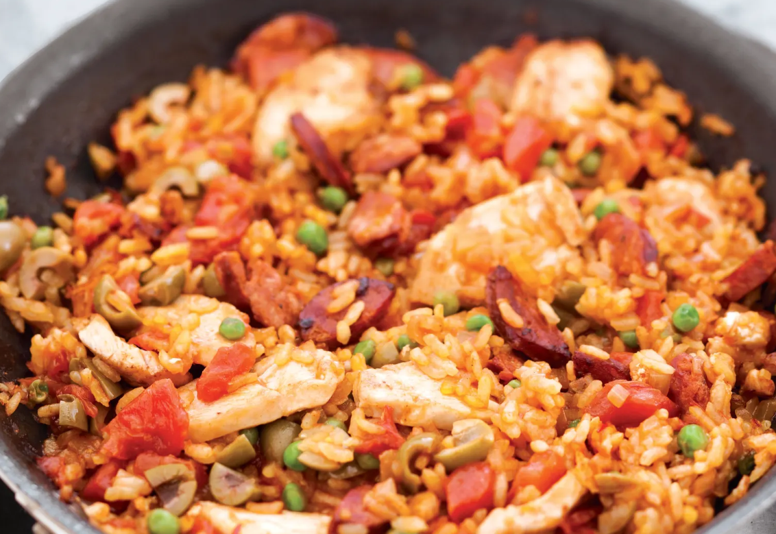 Stir in browned chorizo and chicken and any accumulated juices, olives, and peas and increase heat to medium-high. Cook, uncovered, until bottom layer of rice is golden and crisp, about 5 minutes, rotating skillet halfway through cooking to ensure even browning. Season with salt and pepper to taste, and serve.