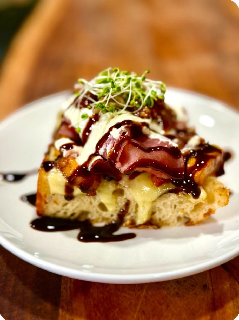 Croissant sourdough toasted in honey butter, stacked with gooey raclette, crisp shaved ham, charred honey, cayenne peaches, whipped goat cheese, honey cayenne pecans, a drizzle of balsamic, and fresh broccoli sprouts. A melt that’s sweet, smoky, tangy, creamy, crunchy, and fresh all in one bite.