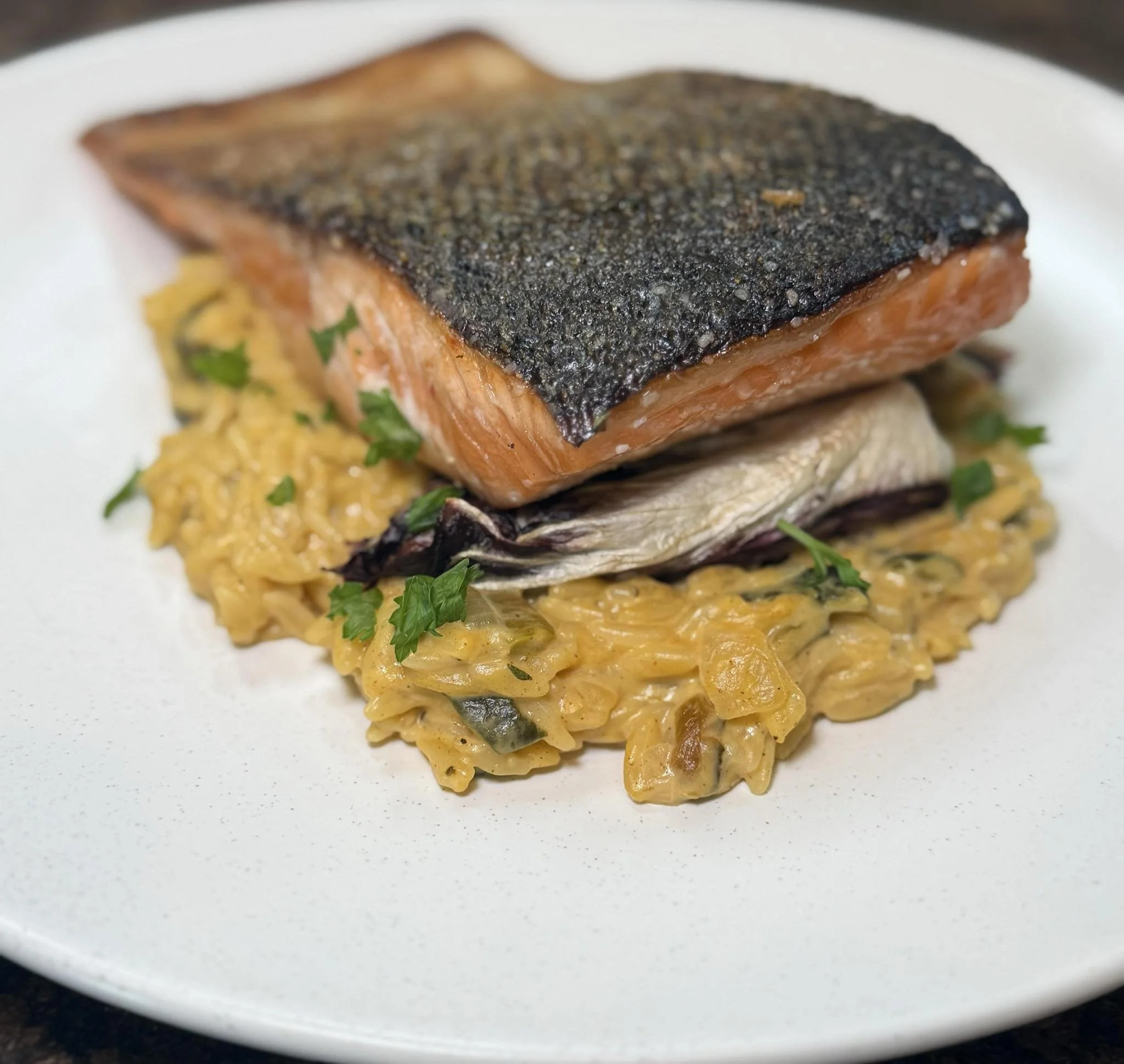 With Pan-Seared Salmon: Pat salmon fillets dry, season with salt, and sear skin side down in oil until crisp. Flip and finish with garlic and thyme. Serve over orzo, skin side up.