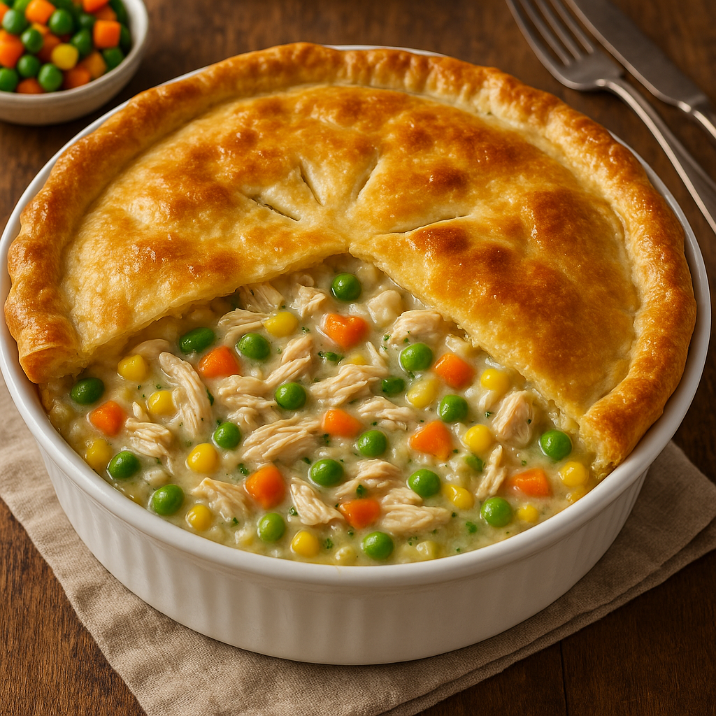 A simple, fast, comforting chicken pot pie made with rotisserie chicken and one top crust only. Perfect for busy nights.