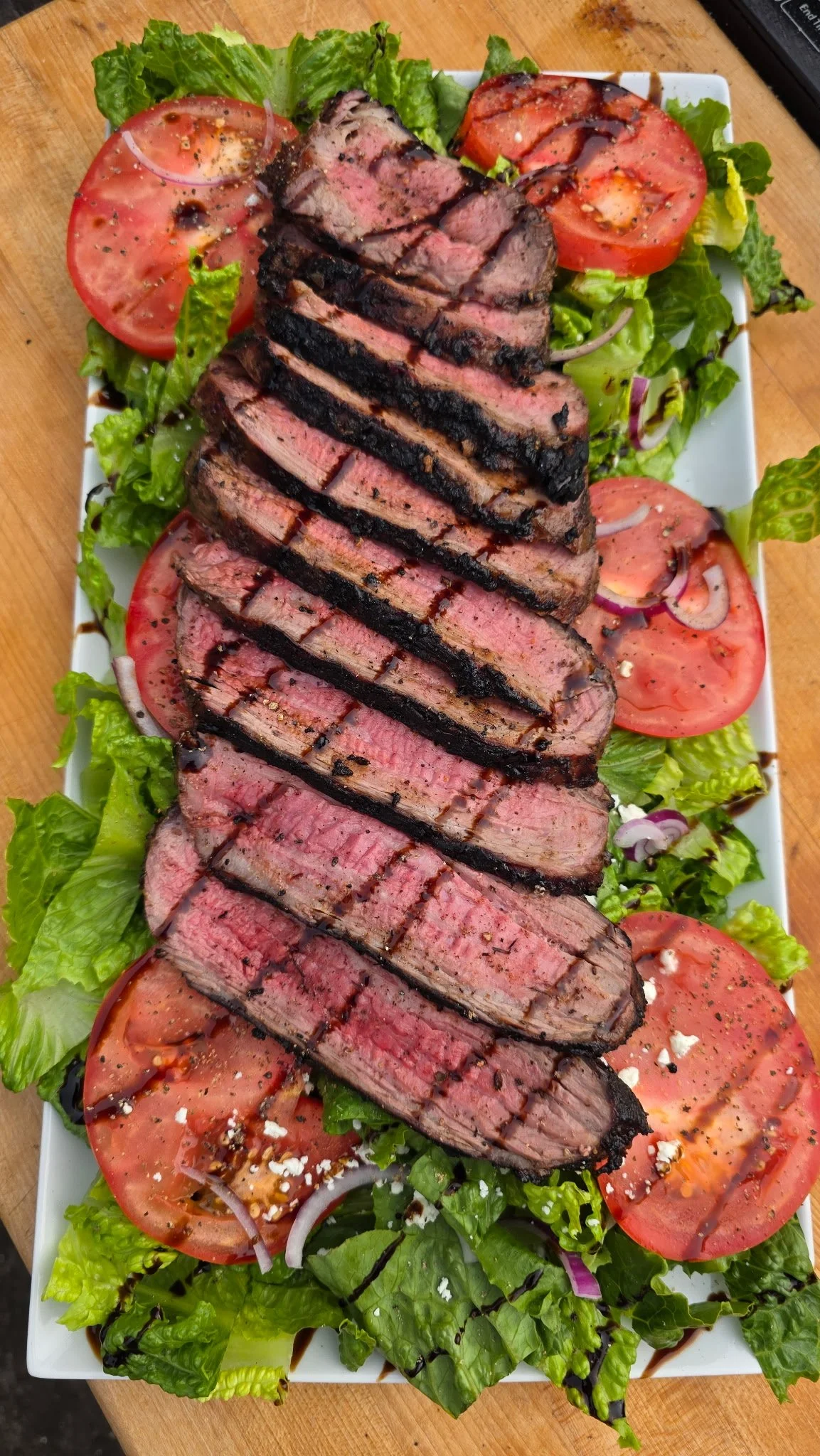 Assemble the Salad: On a large platter or separate dishes, plate the romaine. Top with tomatoes and onion. ed heirloom tomatoes and thinly sliced red onion. Arrange the sliced grilled steak over the salad. If using, sprinkle generously with crumbled blue cheese or feta cheese. Drizzle with balsamic glaze and serve with your homemade Bacon Jalapeno Ranch dressing!