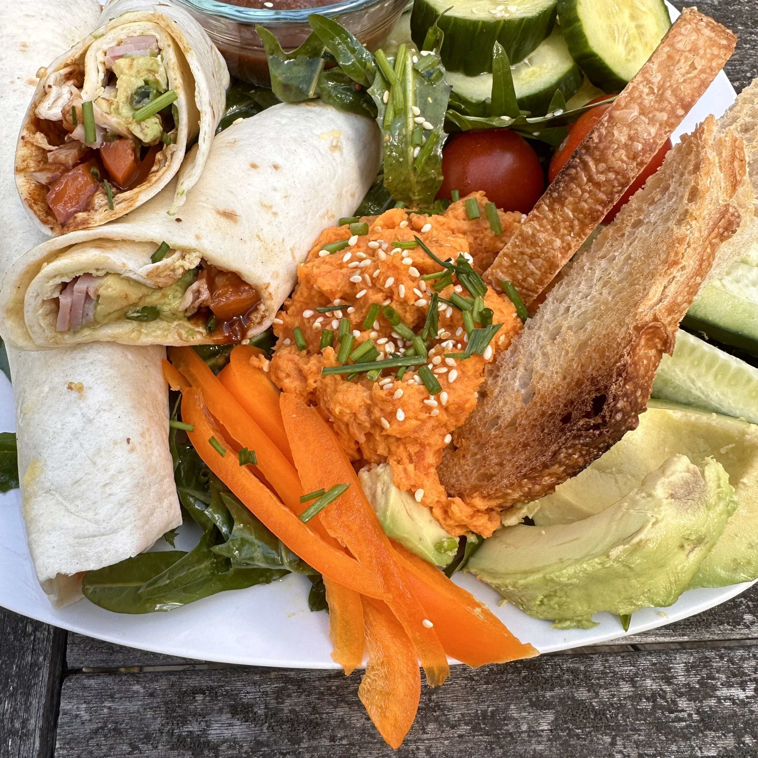 For my Thursday “Let Me Be Frank” lunch live, I did a “spring fresh trio”which included this savory sweet Roasted Carrot Hummus. Along with it I did a quick-pickled Cucumber and an old classic favorite of mine; warm veggie roll-ups all nestled on a bed of citrus-dressed dandelion greens.