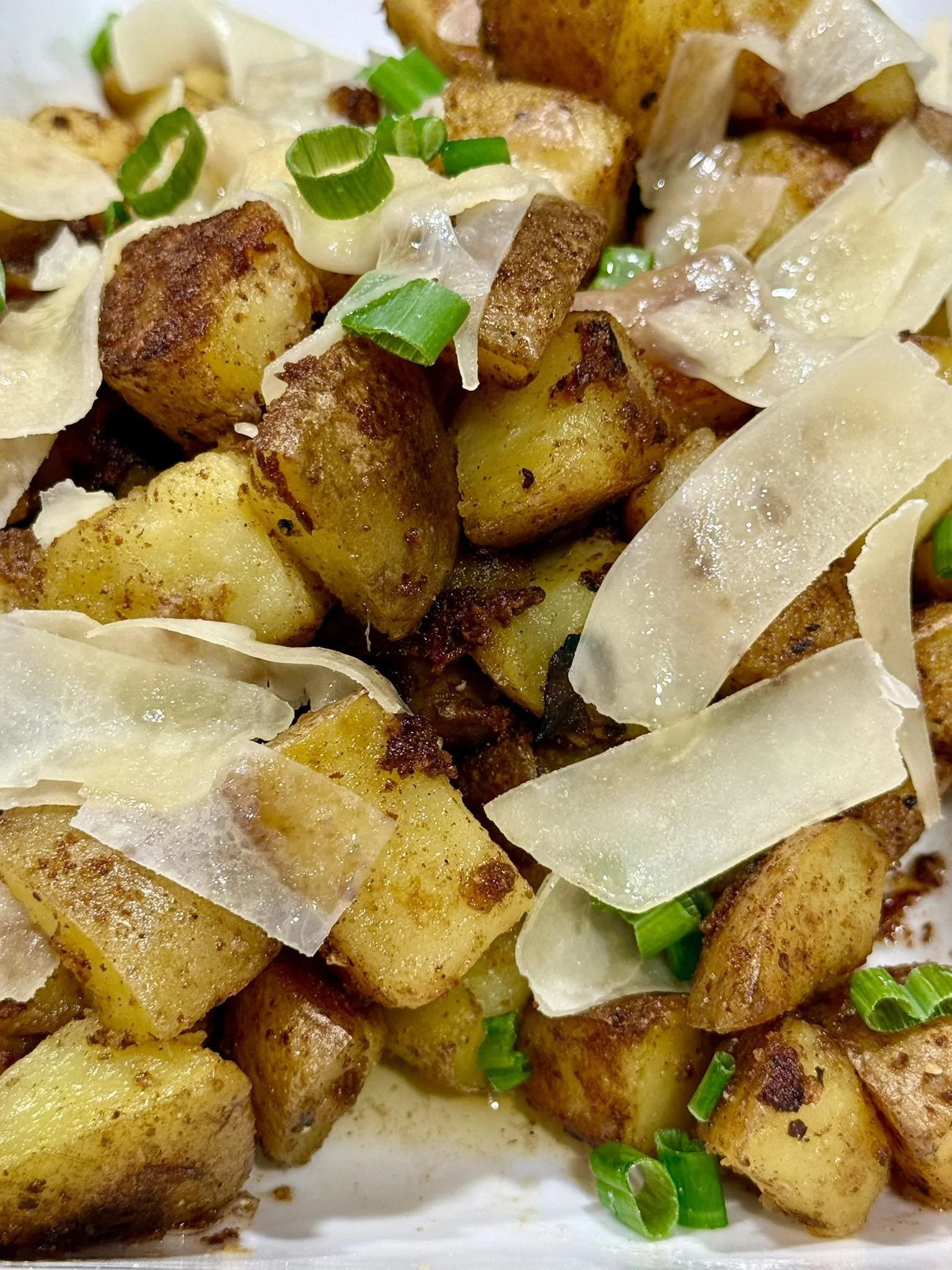 Crispy potatoes finished in nutty brown butter and sweet roasted garlic, tossed until glossy and rich, then topped with Parmesan and green onions for balance.