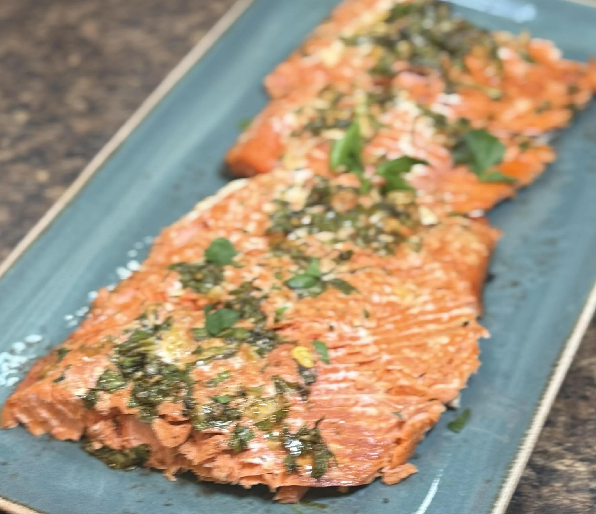 Side Note: When roasting a whole salmon fillet, the thinner edges will cook faster. If you prefer, slice off the thinner, more cooked sections as a snack while you prepare the rest of the salmon.