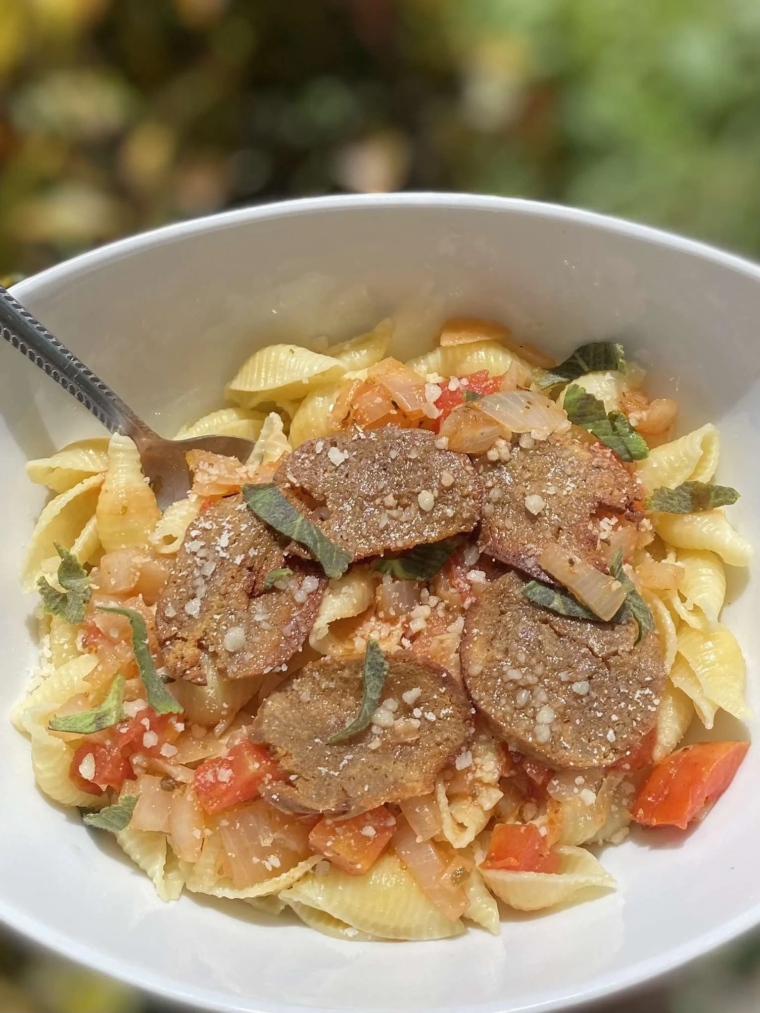 Combine by serving the pepper tomato mixture over pasta or rice and topping with browned seitan slices. Finish with vegan sour cream, vegan Parmesan, and fresh herbs.