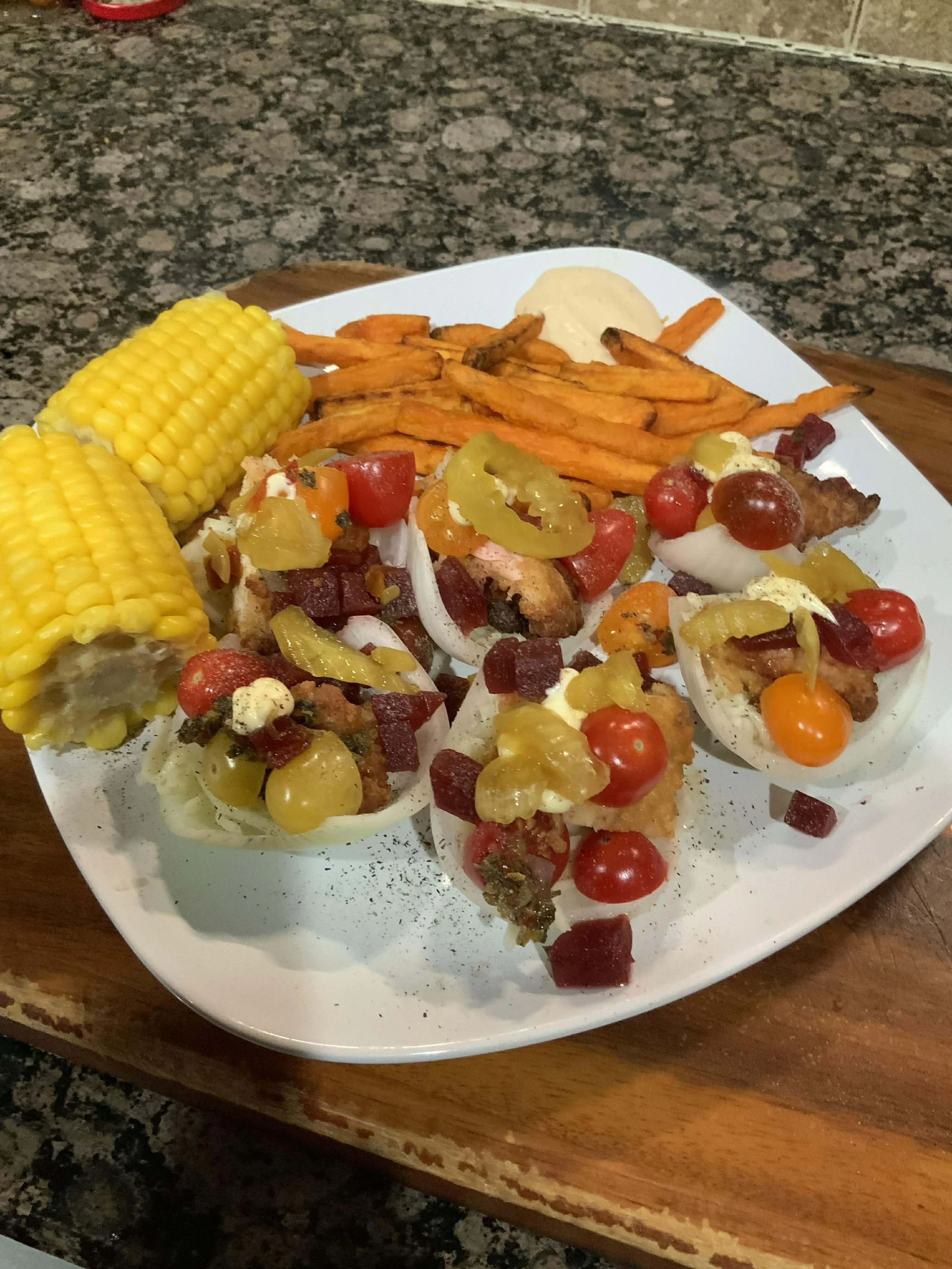Sweet Vidalia onion layers turned into crunchy cups and stacked with spicy chicken, sharp pickles, juicy tomatoes, and creamy peppered mayo for a bold girl dinner moment that hits spicy, tangy, sweet, and crunchy all at once