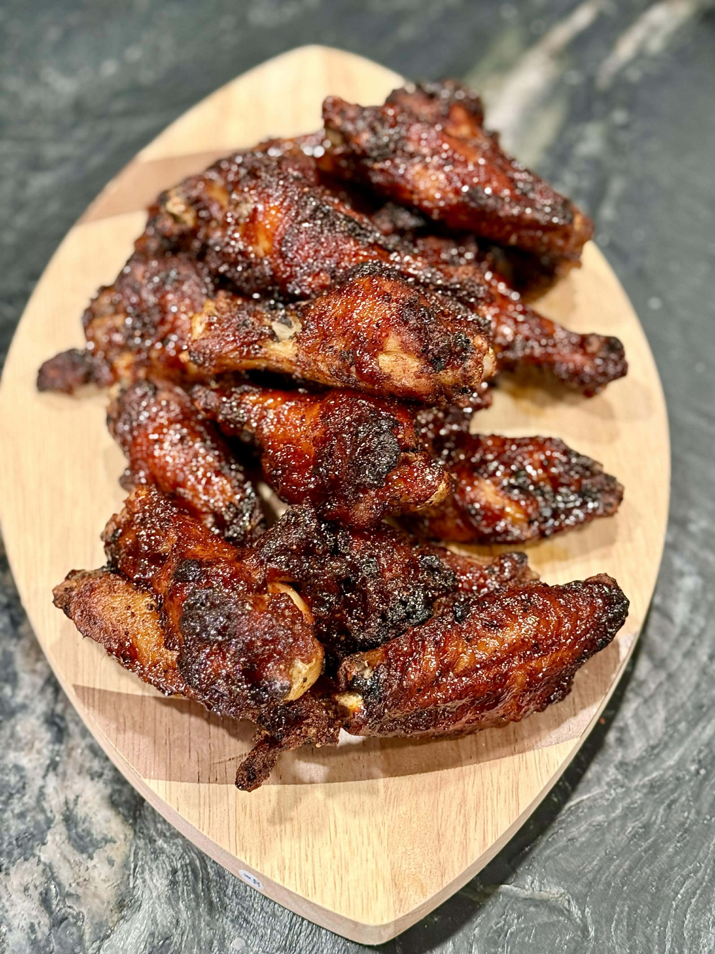 Deep-fried wings finished with brown butter and black garlic, then brushed with a glossy strawberry–ancho glaze and set in the oven so they stay crispy. Sweet smoky heat, rich umami, tacky shine.