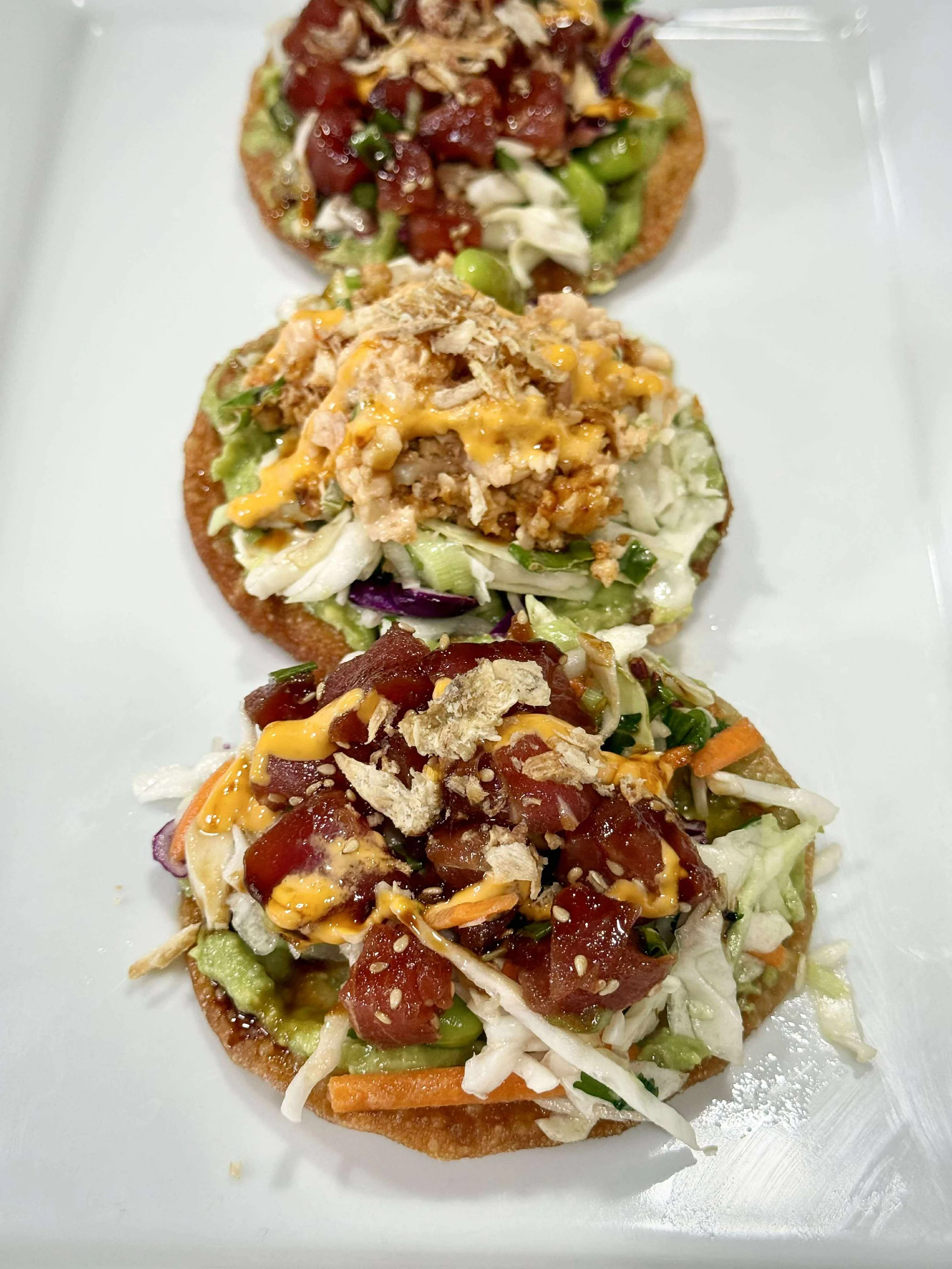 Crispy fried gyoza wrappers layered with sesame avocado, honey lime slaw, and your choice of marinated tuna or spicy shrimp salad—finished with crispy fried shallots, spicy mayo, and a drizzle of eel sauce. A bold bite, Texas-style.