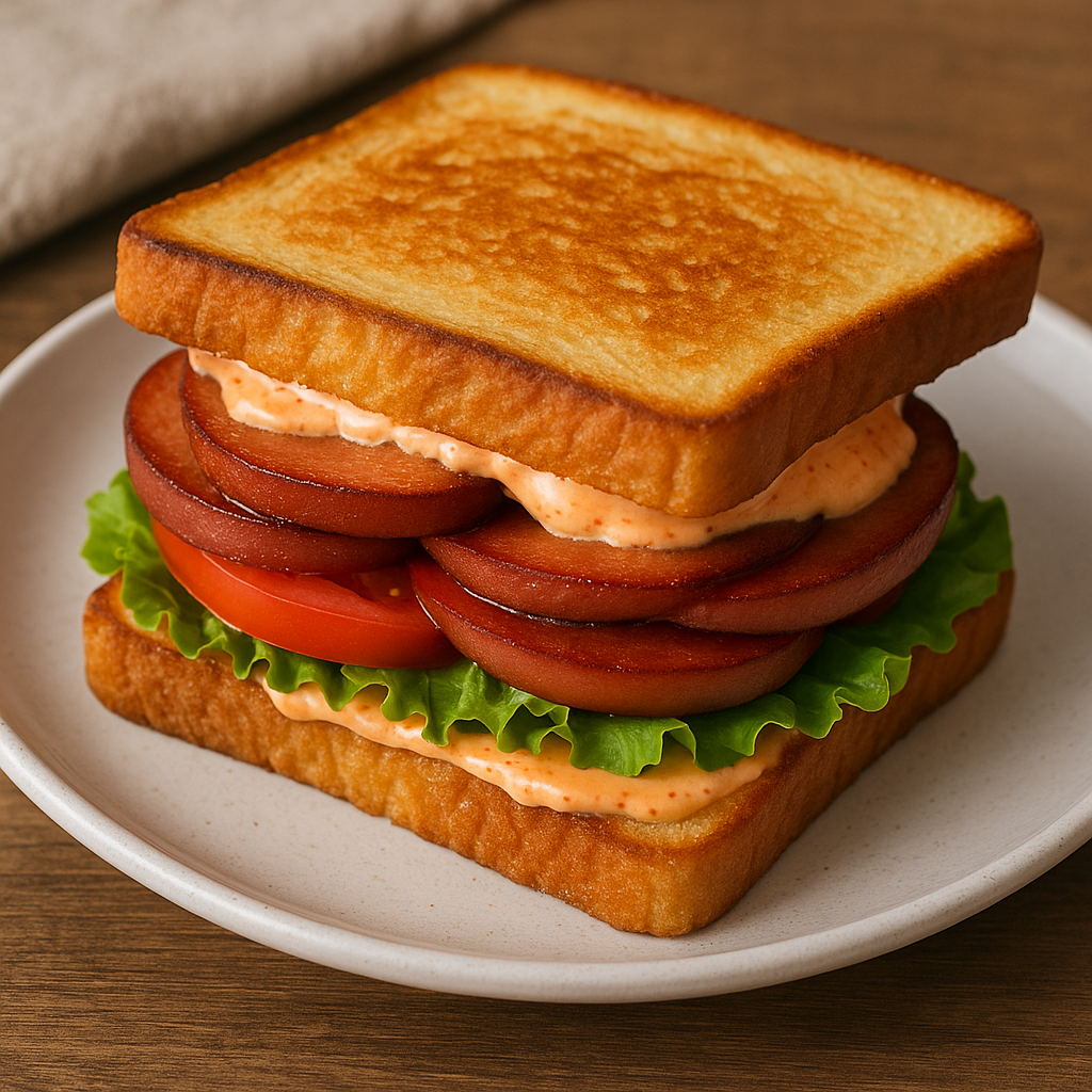 A crispy fried bologna sandwich with toasted bread, fresh toppings, and bold creamy sriracha mayo. Simple, nostalgic comfort food with a spicy kick
