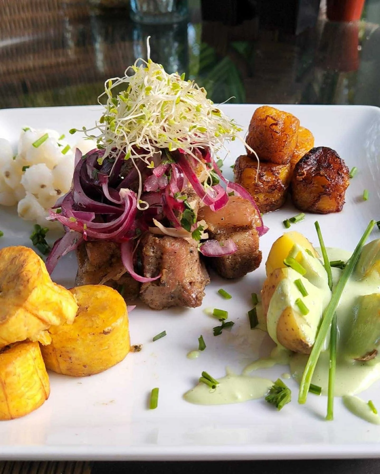 Fritada is a typical plate from the Sierra or Highlands (Quito, Loja, etc). Even though its full name is “fritada de chancho” which literally translates as pork fry-up, the meat is actually cooked in water and orange juice until the water is reduced and the meat is browned in its own fat.