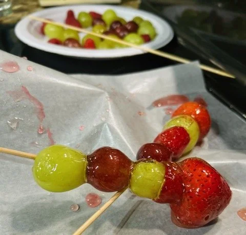 OctoberDragonFly's fruit skewers are dipped into hot sugar for a refreshing and crunchy treat