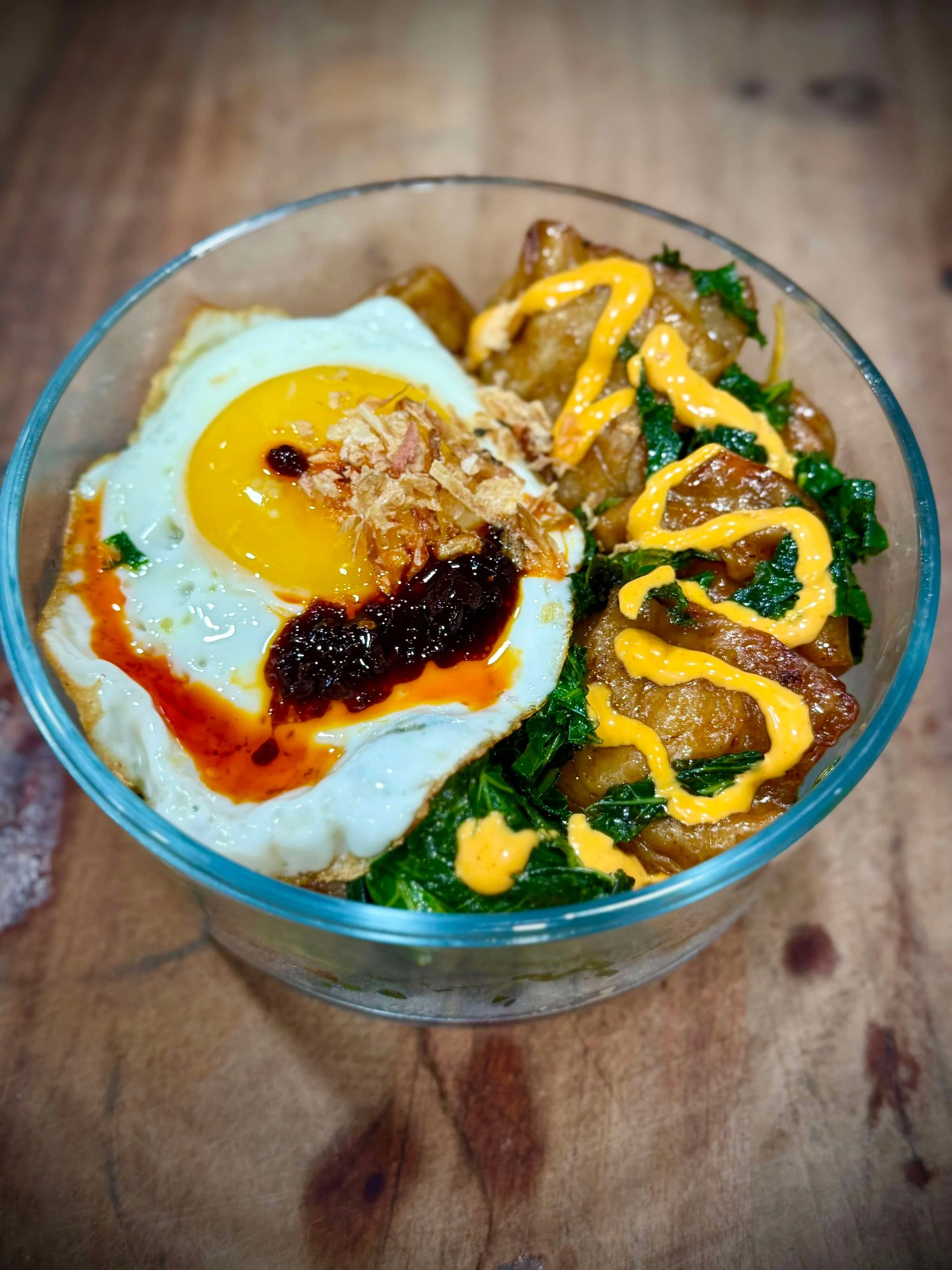 - Spoon hot steamed rice into serving bowls. Add a layer of warm sautéed kale. Top with freshly cooked potstickers. Drizzle with Queen G’s Bold Dumpling Sauce to taste. Add a runny fried egg on top, if using. Finish with Sichuan Crunch, fresh jalapeño slices, crispy fried onions, green onions, and toasted sesame seeds. Optionally, add a light zigzag of Sriracha mayo for a touch of creamy heat. Serve immediately and let the yolk and sauces meld into the rice.