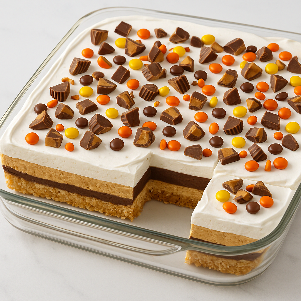 A sweet-and-salty layered dessert with a baked pretzel crust, creamy peanut butter cheesecake filling, chocolate pudding, and a fluffy whipped topping finished with peanut butter candies