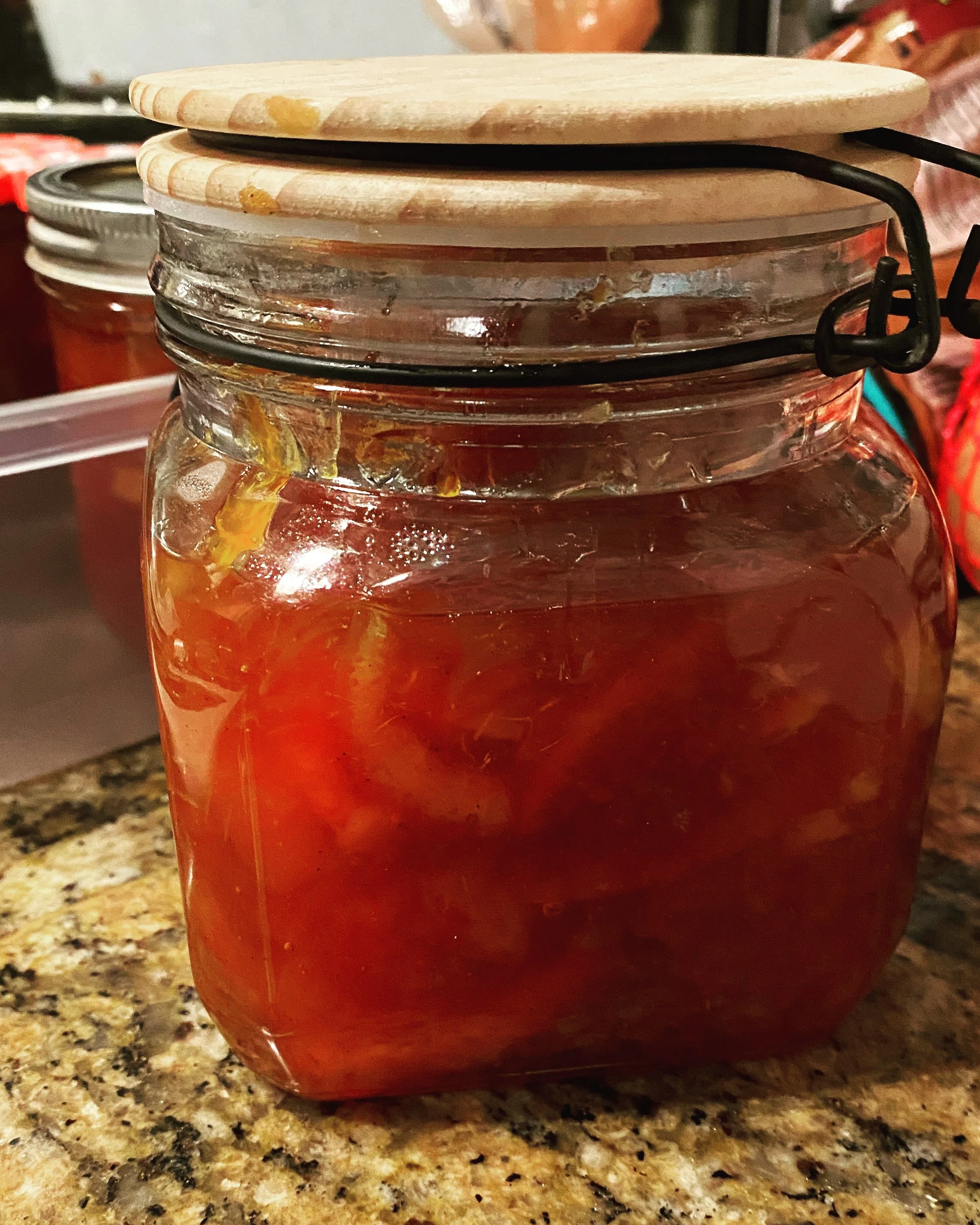A pal recently send me a box of winter citrus fruit from my garden. I don’t like to waste anything so decided this would be a great chance to make some marmalade and freeze. I use this particular marmalade as a topping but it also is great added to the slow cooker or instance with chicken or pork. The sweet-bitter blend mellows further and compliments the meats and vegetables well. There are many versions of this so as with any fruit based dishes, you will need to adjust for sweetness based on the fruit and natural sugars
