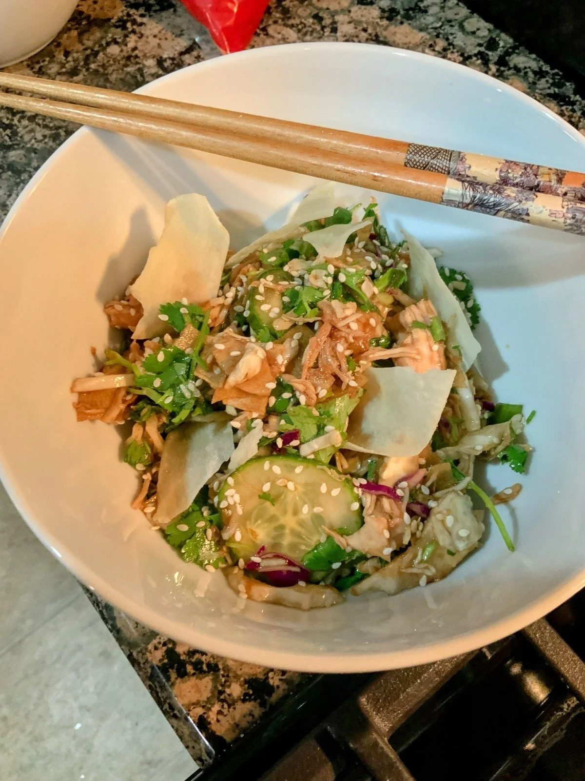 This Chinese Chicken Salad is a refreshing and substitute friendly take by Maggie. Chicken, cucumber, cabbage, carrot, and cassava chips make this salad with a sesame, soy, ginger, and garlic dressing